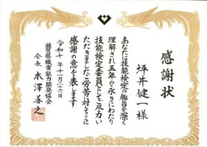 令和7年11月26日(水)に開催されました「令和7年滋賀県職業能力開発促進大会」において、当社社員が滋賀県職業能力開発協会会長表彰・永年勤続(5年)技能検定委員として感謝状を拝受しました。