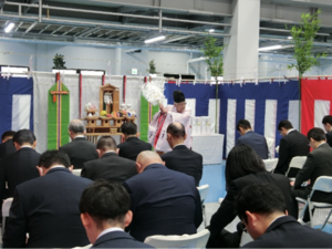 竣工式では、設計事務所および施工会社の皆さま出席のもと神事を執り行い、新建屋の安全操業と今後の事業発展を祈念いたしました。