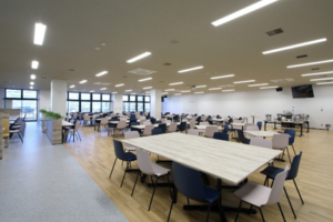 2. 従業員同士のコミュニケーション促進と働きやすい環境づくりを目的として、開放的な食堂と事務所を新設しました。